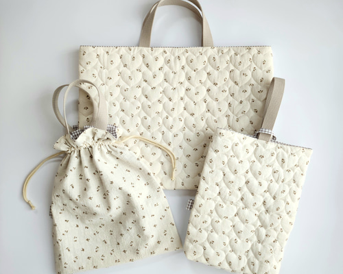 sorahana レッスンバッグ 上履き袋 お着替え袋 ヌビ ハートキルト さくらんぼハートキルトのレッスンバッグ・上履き入れ・お着替え袋3点