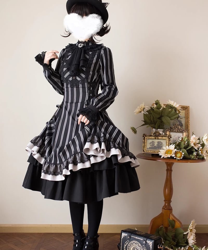 - コスチューム・コスプレ > コスプレ衣装 > 【FRILL】ゴスロリ ロリータ ドレス ワンピース ティアード ストライプ Miss Point / Point Manor クラシックロリィタ 黒白ストライプSP版 長