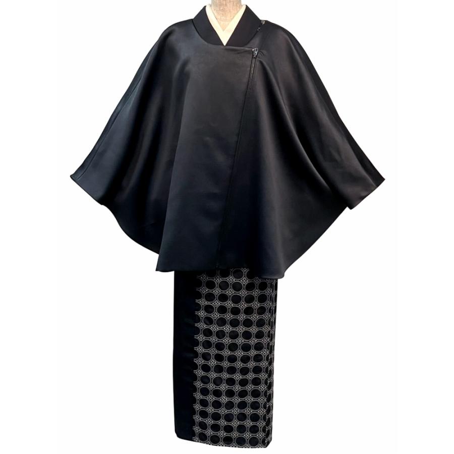 【極美品】アクリス ケープポンチョコート 高級 シルク100% 黒 皇室御用達 レザー調 ポンチョ 洗える 日本製 ケープ ブラック 和装コート co-62