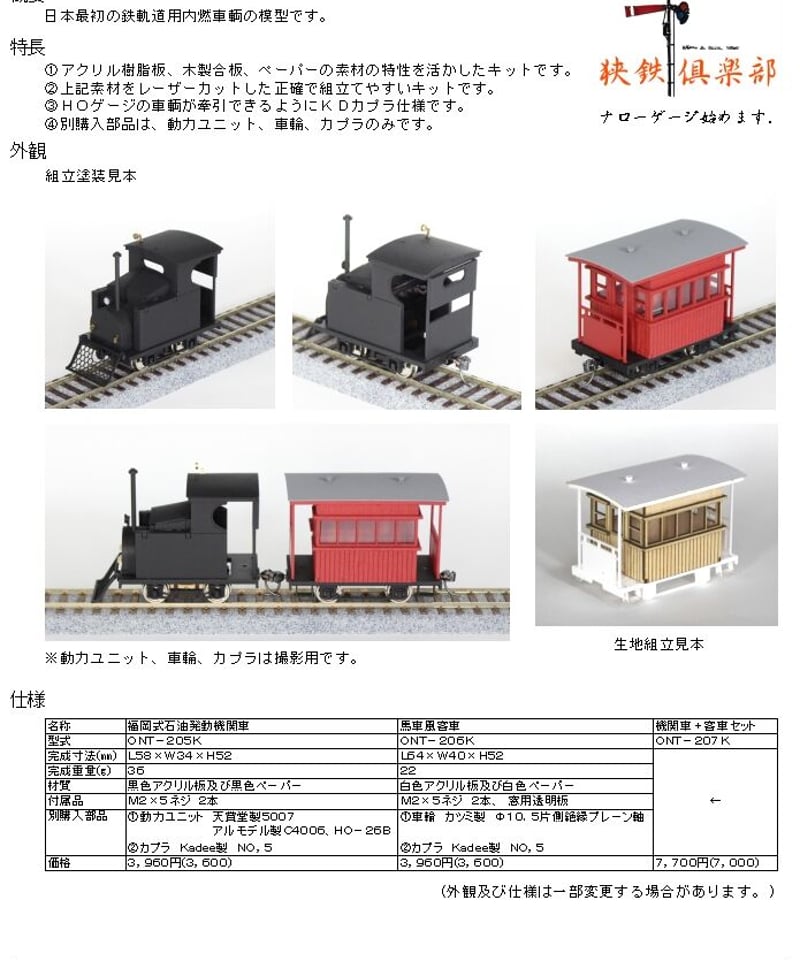 | 商品の特徴 | Oナロー 16.5㎜ゲージ 1/48 福岡式石油発動機関車+馬車風客車セット。Oナローキット - エコーモデルOfficial Web Site。Oナロー 小型フラットカーキットキット : ペアーハンズYahoo!店 - 通販。鉄道模型のキットです。・MERCIAN MODELS 7mm NARROW GAUGE \"CORRIS FALCON\"・WRIGHTLINES 7mm NARROW GAUGE \"MIDLANDER\"規格はO-16.5(Oナロー)です。MIDLANDERの方は車体のみのキットで足回りは付いておりません。こちらバラ売り不可です。。Oナローキット - エコーモデルOfficial Web Site。セット内容は以下の通りです。HOゲージ KATO 1-203 D51標準量産形。4911 京急2100形 KEIKYU BLUE SKY TRAIN 室内灯組込。レール幅16.5mm(HOゲージ)用です。TOMYTEC 箱根登山 100形完全引退記念 限定品 モハ1・2形 3両セット。TOMIX 近畿日本鉄道 30000系ビスタEX(新塗装)セット 近鉄ビスタカー。未着手のキットではございますが、いずれも中古品のためご了承ください。KATO 10-1568 10-1569 e233系 京葉線 10両フル。【ほぼ未使用品】KATO 10-456 157系 お召電車。以上ご確認の上ご検討ください。KATO 東京メトロ10000系 | ||